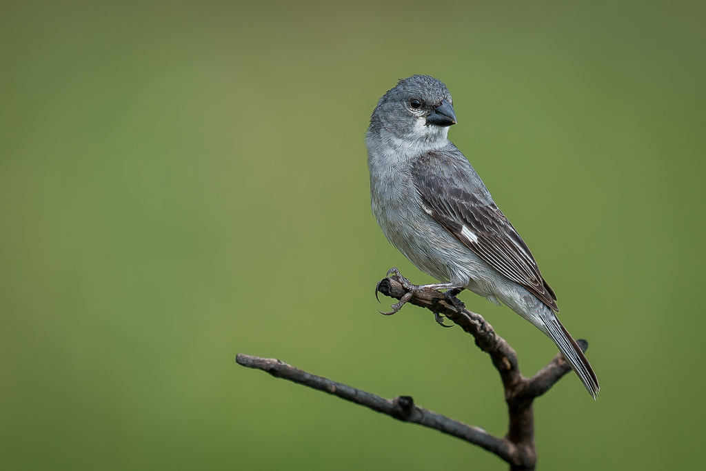 Machos cinza-chumbo uniforme, fêmeas pardas. Medem aproximadamente 11 cm e pesam entre 10 e 12 gramas.