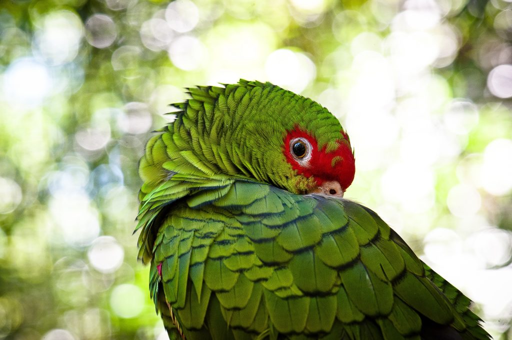 Plumagem verde, testa e bochechas vermelhas. Medem aproximadamente 32 cm e pesam entre 360 e 400 gramas.