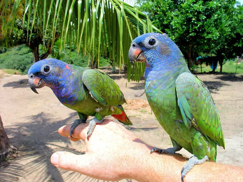 Plumagem verde, cabeça e pescoço azuis, bico vermelho na base. Medem aproximadamente 28 cm e pesam entre 240 e 260 gramas.